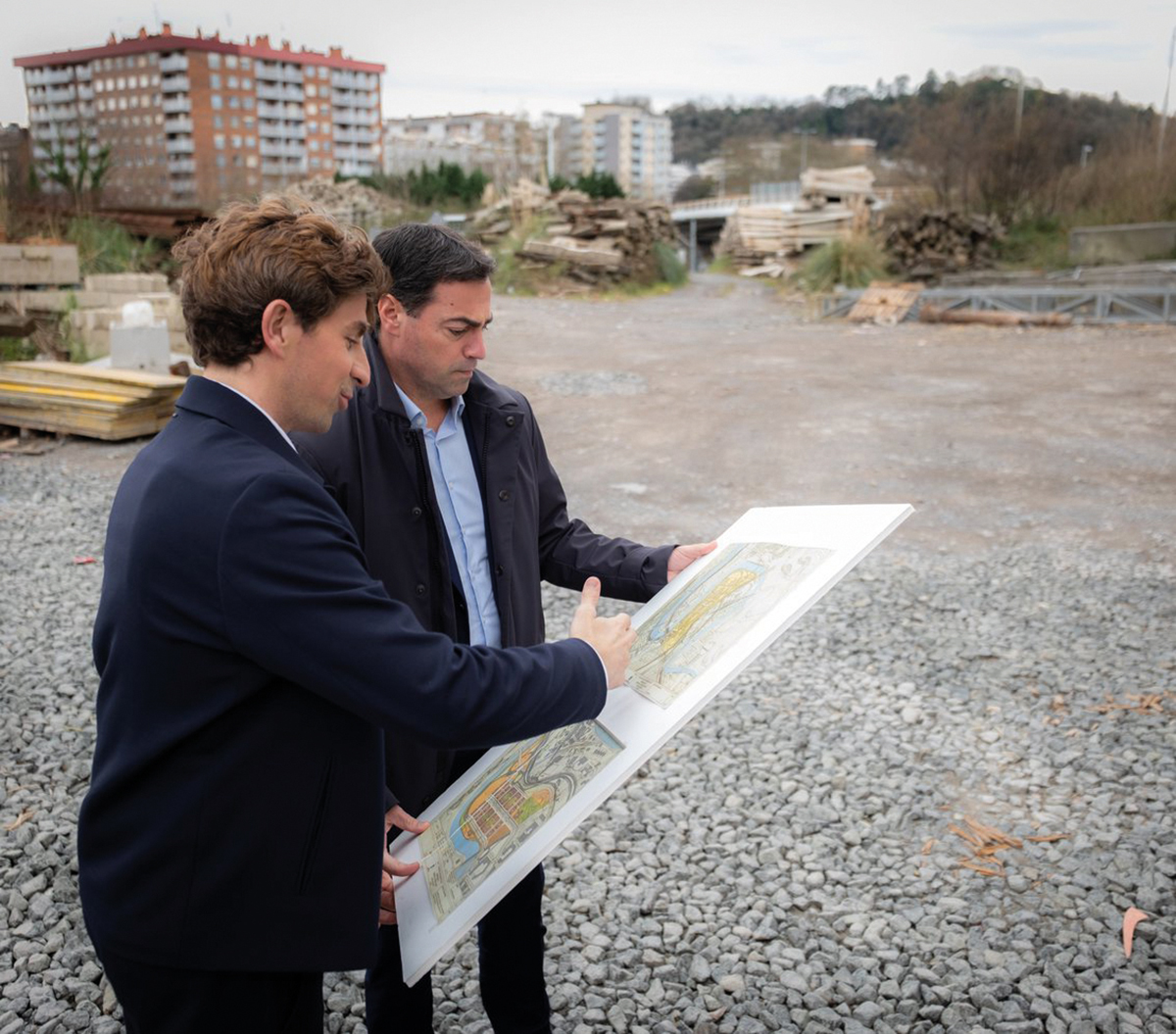 Imanol Pradales lehendakaria eta Jon Insausti alkatea Loiolako Erriberan, zuzkidura bizitokien inguruko agerraldi batean.EAJ
