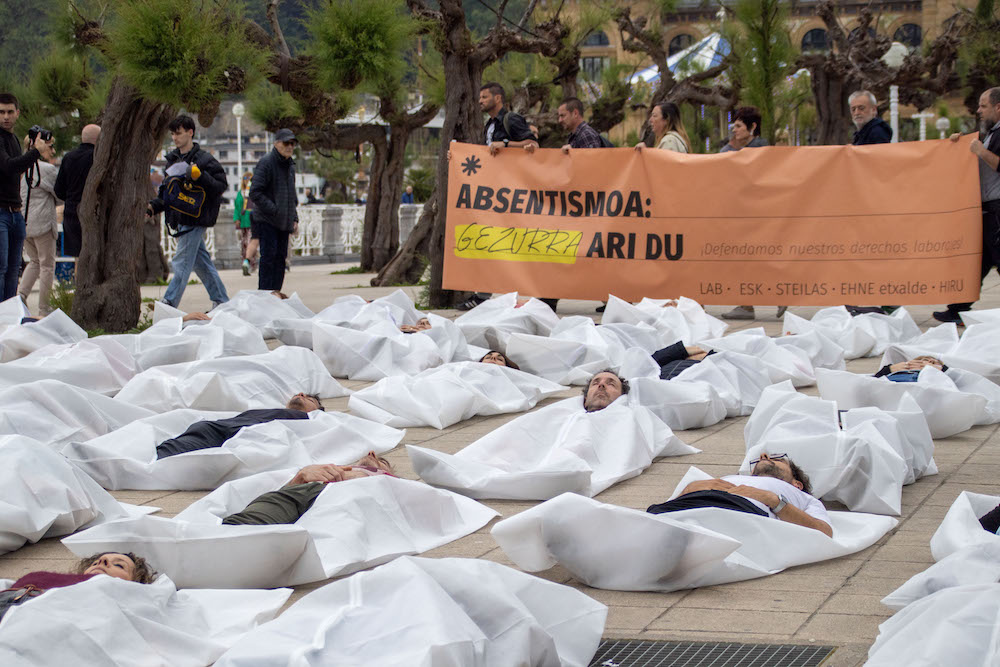 "Absentismoaren gezurra" salatzeko mobilizazioa, Donostian.LAB Laneko Segurtasunaren eta Osasunaren Nazioarteko Eguna da gaur, apirilaren 28a, eta, hori dela eta, LAB, ESK, Steilas, EHNE-Etxalde eta Hiru sindikatuek manifestazioa egin dute Donostian eguerdian, Absentismoa: gezurra ari du. Gure lan-eskubideak defenda ditzagun! lelopean. Eusko Jaurlaritzaren egoitzaren parean amaitu da mobilizazioa, eta sindikatuek 2025ean Euskal Herrian hildako 84 langileak irudikatu dituzte, euren lana aitortzeko eta heriotzak salatzeko: “Lan batzuek hil egiten dute, eta beste askok —gehienek— ez dute bizitzen uzten”.