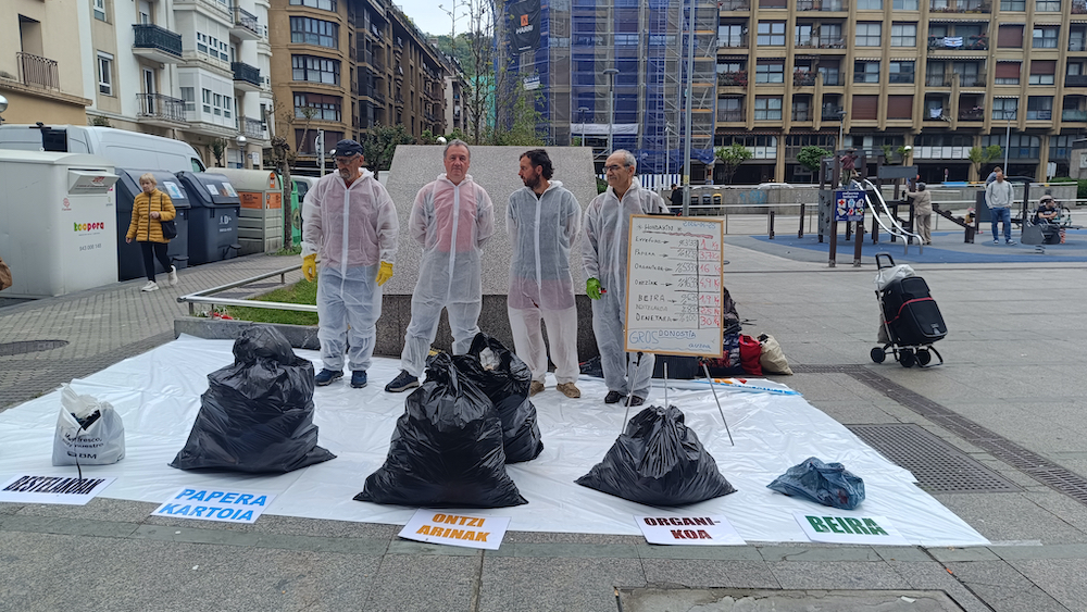 Hori salatzeko, performance bat egin zuen Donostia Bizirik-ek larunbatean, Groseko Nafarroa Beherea plazan. Hain zuzen ere, errefusaren edukiontzi batetik hondakinak atera, kalean zabaldu, gaika banandu, pisatu, berriro jaso eta bakoitza zegokion edukiontzira bota zituzten, handik pasatzen ziren herritarren begiradapean.