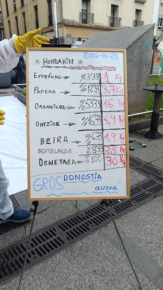 Azaldu dutenez, guztira, 30 kilo hondakin atera zituzten errefusaren edukiontzitik, eta honela banatu zituzten: errefusa, kilo bat (%3,33); papera eta kartoia, 3,7 kilo (%12,33); organikoa, 16 kilo (%53,33); ontzi arinak, 4,9 kilo (%16,33); beira, 1,9 kilo (%6,33) eta bestelakoak, 2,4 kilo (%8,33). “Donostia Bizirik-ek lortutako emaitzek frogatzen eta azaltzen dituzte Donostiako gaikako bilketako emaitza txarrak”, salatu dute, udalari “neurri eraginkorrak” eskatzearekin batera, “gutxienez, Gipuzkoako beste herrien batez bestekora heltzeko”.
