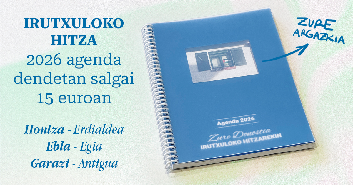 IRUTXULOKO HITZAko 2026ko agenda moldagarria hiriko hiru liburu dendetan salgai dago: Antiguako Garazin, Egiako Eblan eta Erdialdeko Hontzan.